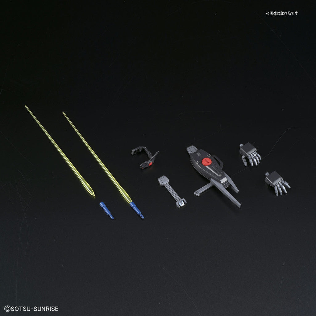 The Barzam from "Zeta Gundam" features ball joints for a wide range of motion, and it's armed with its beam rifle, two beam sabers, and the Vulcan Pod System. The mono eye is a clear part, and many of the other parts are molded in color to make painting minimal or unnecessary; foil stickers are included for the markings. Molded in dark gray, red, blue, yellow and black plastic.