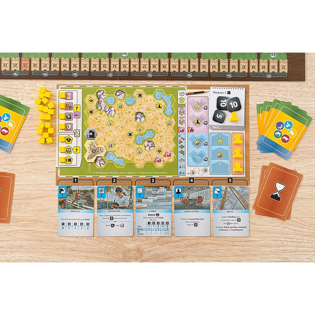 Each player has a set of five action cards to manage their gameplay, and the power of an action is determined by the slot the card currently occupies. The cards in question are: CARDS: Allows you to gain new zoo cards (animals, sponsors, and conservation project cards). BUILD: Allows you to build standard or special enclosures, kiosks, and pavilions. ANIMALS: Allows you to accommodate animals in your zoo. ASSOCIATION: Allows your association workers to carry out different tasks. SPONSORS: Allows you to play a sponsor card in your zoo or to raise money.