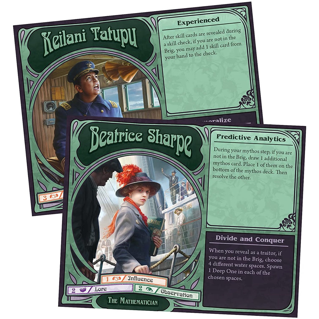 Lurking within the depths of the Atlantic Ocean are a swarm of vicious, unspeakable horrors: the Deep Ones, led by Mother Hydra and Father Dagon. For reasons unknown, they have set their sights on theAtlantica, and their minions, taking the form of human-Deep One hybrids, have infiltrated the steamship to help sink it from within. Each game ofUnfathomablehas one or more players assuming the role of one of these hybrids, and how well they can secretly sabotage the efforts of the other players might mean the difference between a successful voyage and a sunken ship.